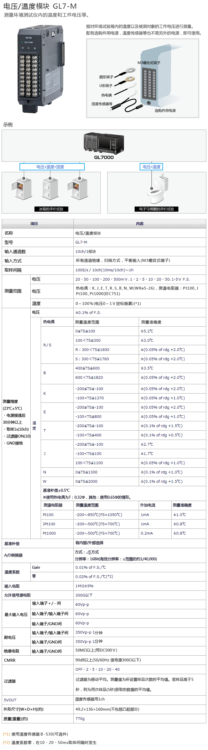 GL7-M电压温度模块是一个模块标配10个通道,GL7-M电压温度模块可以直接测量电压和温度信号,同时GL7-M电压温度模块还具有GL7-V的所有功能。用户可以根据需要选择相应的测试模块。