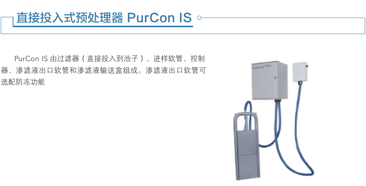 PurCon IS 由过滤器(直接投入到池子)、进样软管、控制器、渗滤液出口软管和渗滤液输送盒组成