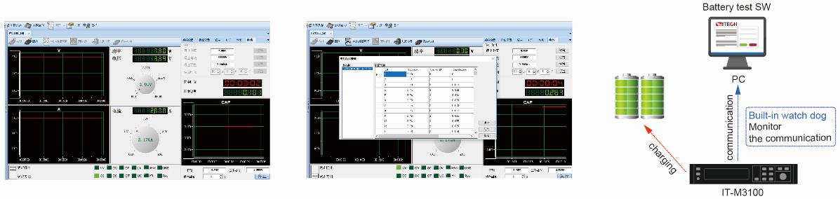 IT-M3100系列具有电池充电功能,可对电池进行充电测试。用户通过面板就可自行设置电池四种测试关断条件:关断电压、关断电流、关断容量和充电时间。当四者中任意一种条件满足时,即会自动中断测试。测试过程中可观测电池的电压、充电时间和已充电容量。同时,IT9000上位机软件配置看门狗功能,为用户提供可靠的自动化测试方案。