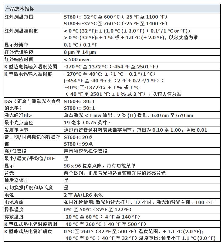 | ST80+ 和 ST60+ 的特性和优点:测量范围: -32°C 至 760 °C /-25 °F 至 1400 °F (ST80+),或 -32°C 至 600 °C/-25°F 至 1100 °F (ST60+)借助软键按钮和点阵式显示屏,轻松访问高级功能可测量距离更远、体积更小的对象,D:S比率达 50:1 (ST80+) 或 30:1 (ST60+)兼容所有标准迷你接头 K 型热电偶,保留在热电偶上的投资可调辐射系数功能(内置材料表),让用户放心测量多种表面捕获多个数据点(ST80+ 多达 99 个,ST60+ 多达 20 个)2 种级别的背光高度,轻松适应各种光照条件声音和视觉警报,及时提示用户测量值是否超出了设定的极限值通过最小值、最大值、平均值和 DIF 功能快速识别问题随附的 K 型热电偶珠式探针便于立即进行接触式测量1 % 的测量准确度让用户放心检修设备多功能界面有 6 种语言可供选择 |