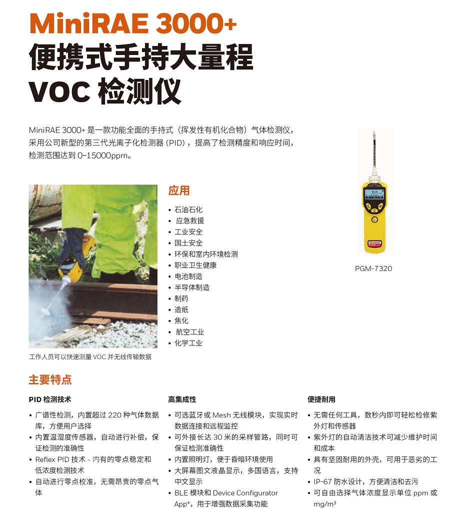 MiniRAE 3000+是一款功能全面的手持式(挥发性有机化合物)气体检测仪,采用公司新型的第三代光离子化检测器(PID),提高了检测精度和响应时间,检测范围达到0-15000ppm