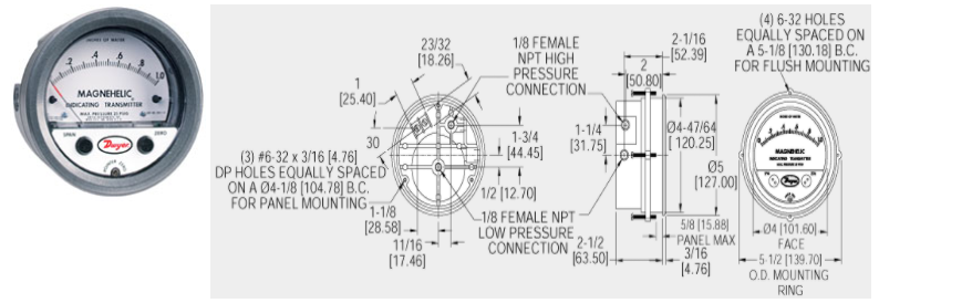 尺寸:4英寸(101.6mm)直径表盘,5英寸(127mm)O.D.x 2-11/16(68.3mm)