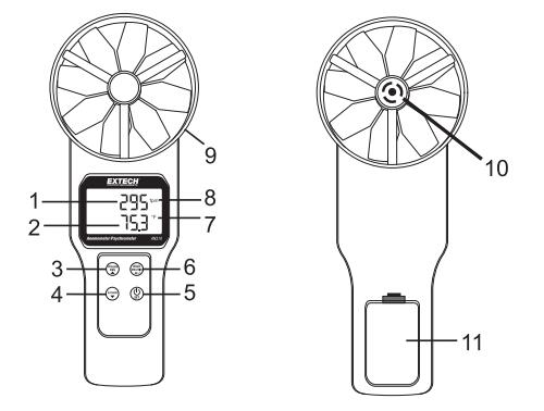 3. 在仪表盘上时, 上部显示器可以显示空气流速或相对湿度 (使用 u/模式按钮切换。较低的显示数字显示气流,露点温度、湿球温度或空气温度 (使用 l/模式按钮滚动)。