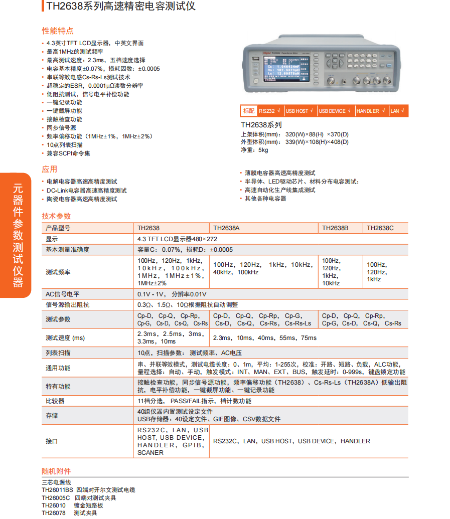 本网页所展示的有关【TH2638系列高速精密电容测试仪】的信息/图片/参数等由的会员【同惠电子 -深圳柏莱科技有限公司 】提供,由柏莱仪器网-专业销售仪器仪表服务商-深圳柏莱科技有限公司会员【同惠电子 -深圳柏莱科技有限公司 】自行对信息/图片/参数等的真实性、准确性和合法性负责,本平台(本网站)仅提供展示服务,请谨慎交易,因交易而产生的法律关系及法律纠纷由您自行协商解决,本平台(本网站)对此不承担任何责任。您在本网页可以浏览【TH2638系列高速精密电容测试仪】有关的信息/图片/价格等及提供 【TH2638系列高速精密电容测试仪】的商家公司简介、联系方式等信息。
